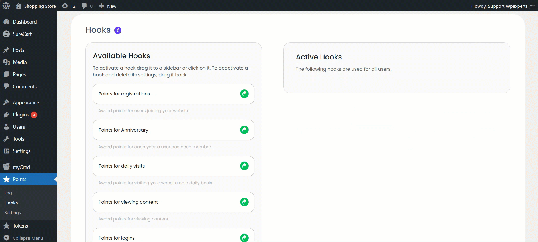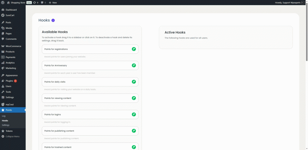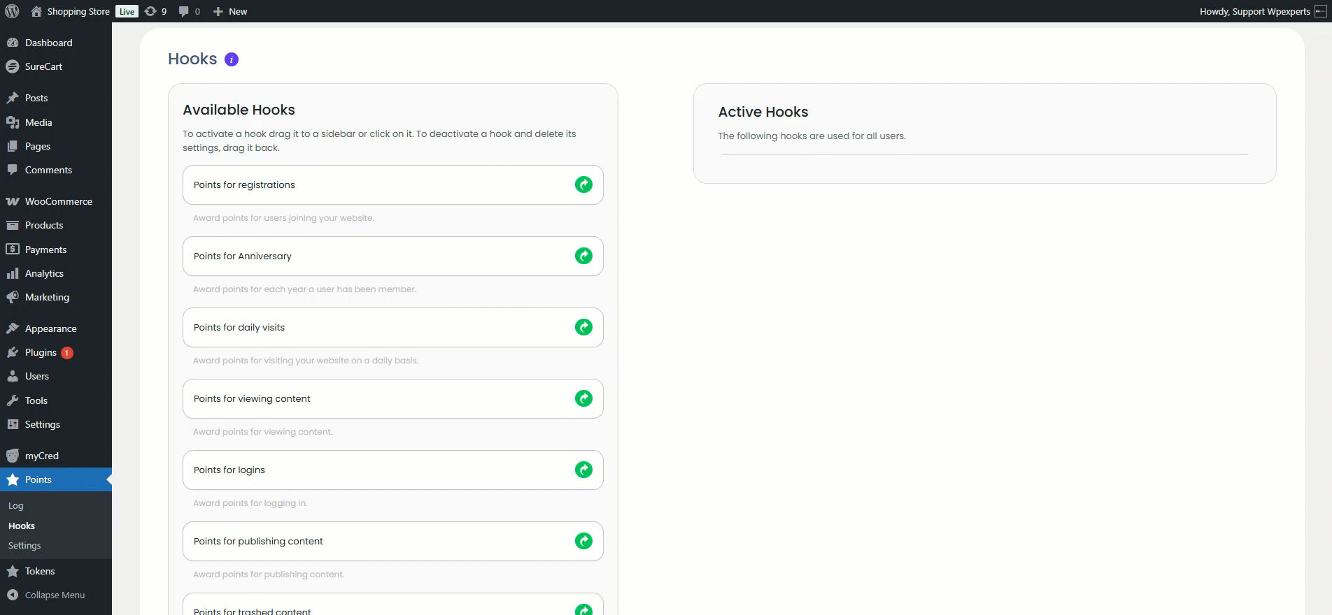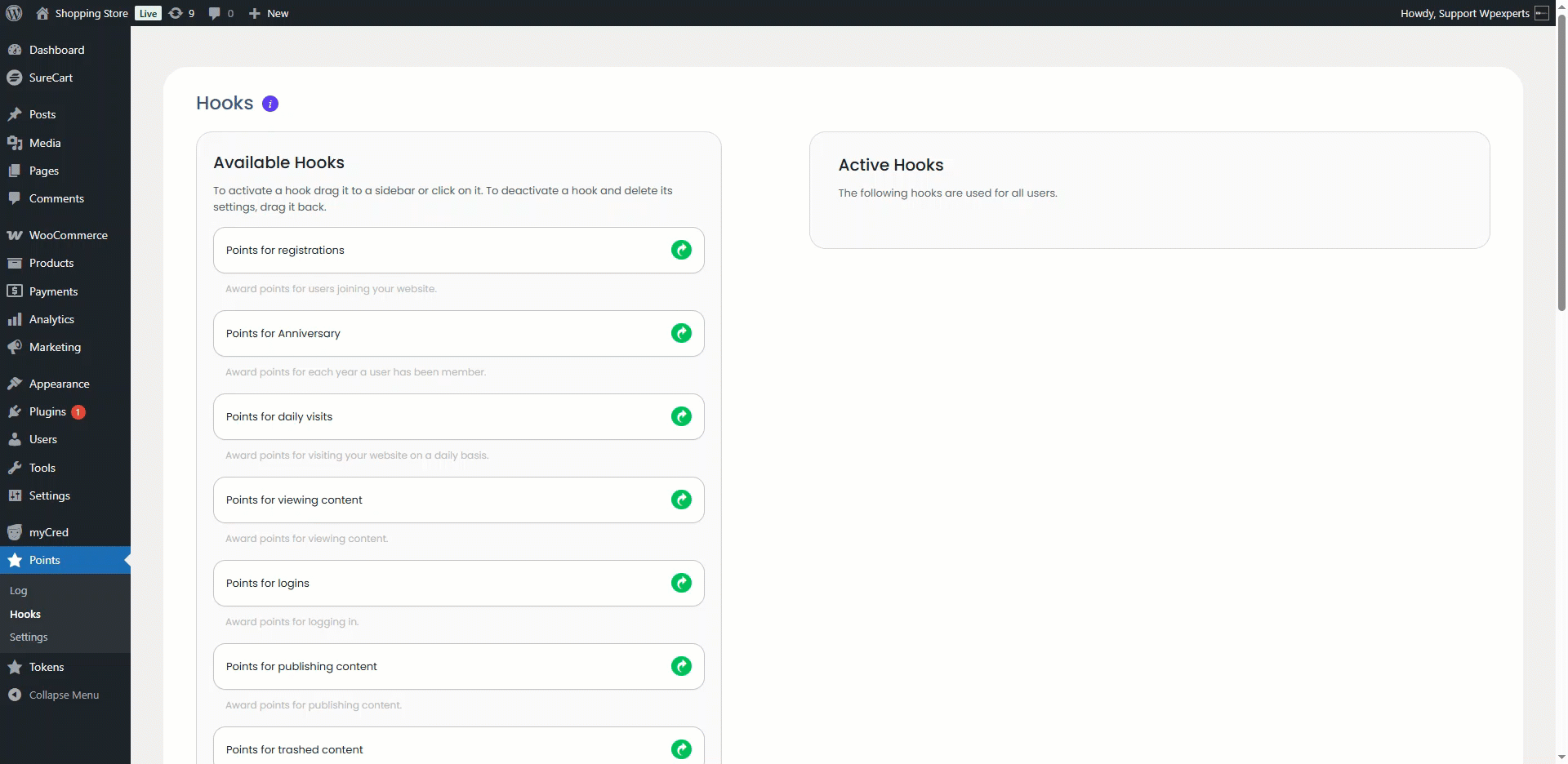 - Drag and drop the Points for each order hook to the Active Hooks section.