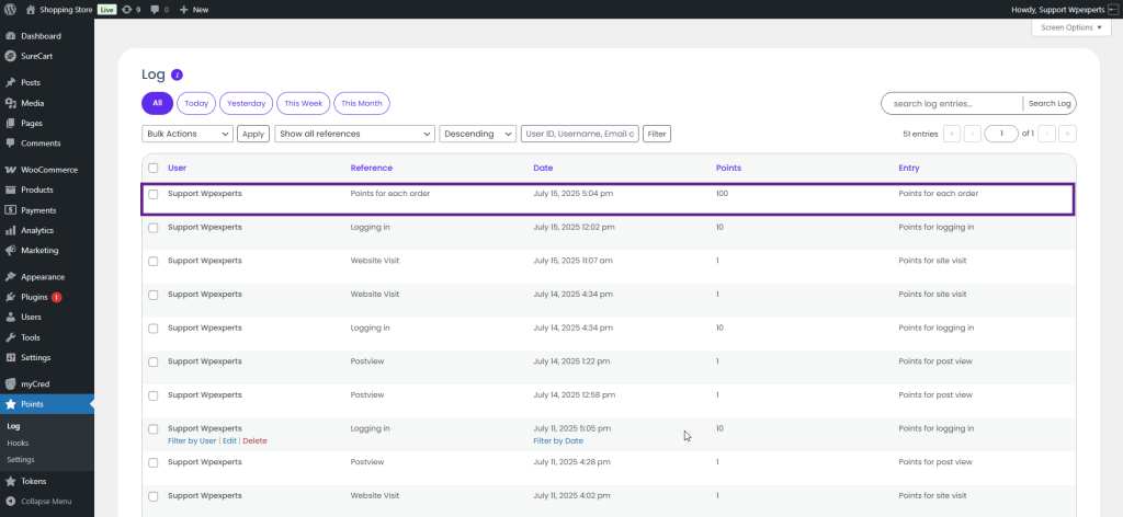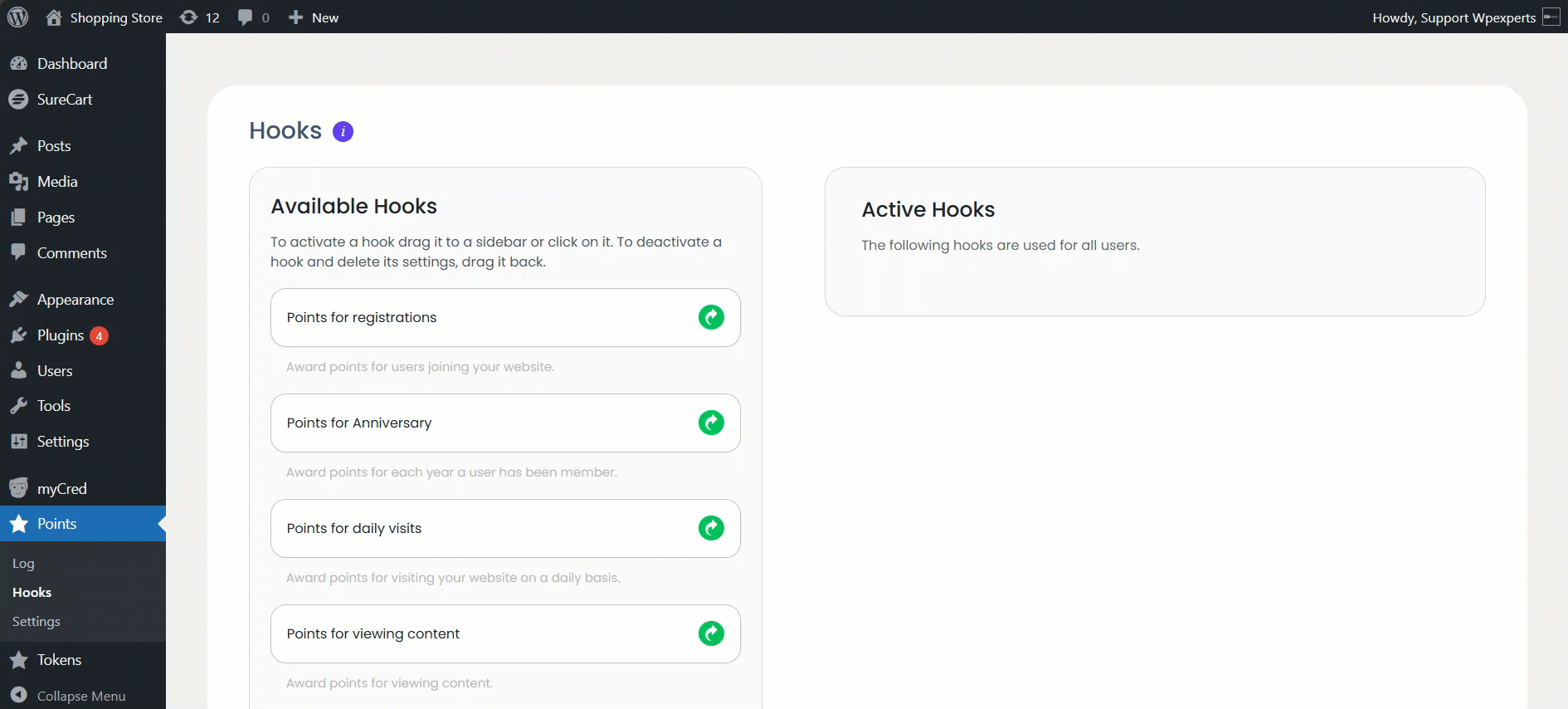 With these hooks configured, MyCred will automatically assign points to users according to the defined criteria whenever an order is placed via SureCart.