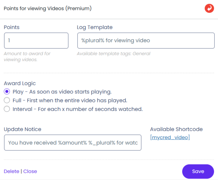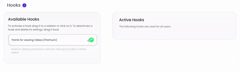 The built-in video hook only supports YouTube videos. With this plugin, you can embed YouTube and Vimeo videos. As an added extra, you can also show an update message when users gain points for watching a video. This update message is inserted under the video being watched and if you select to award points by interval, it is updated each time a user gains points.