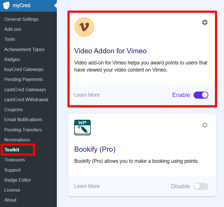 - Navigate to WordPress admin Dashboard > myCred > Toolkit