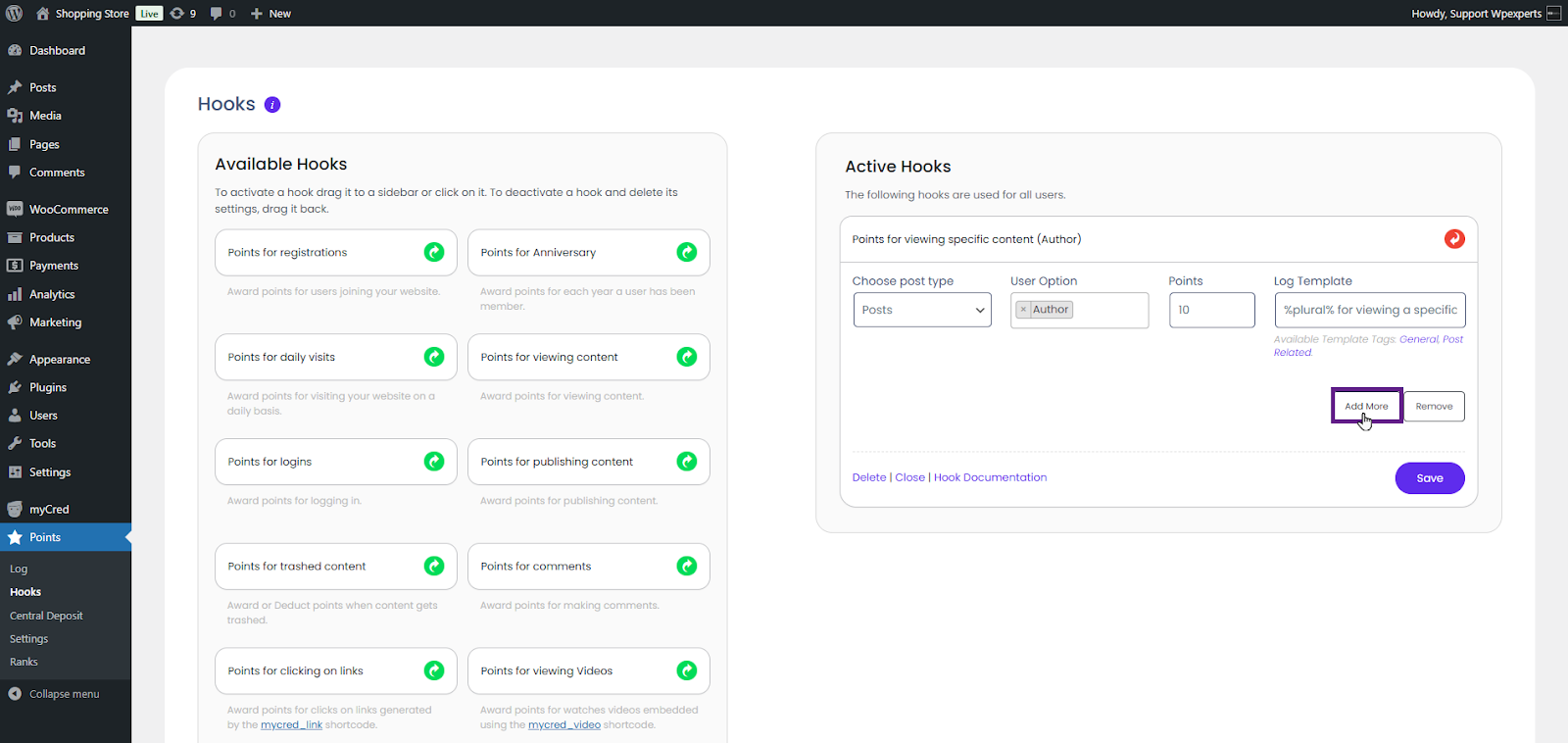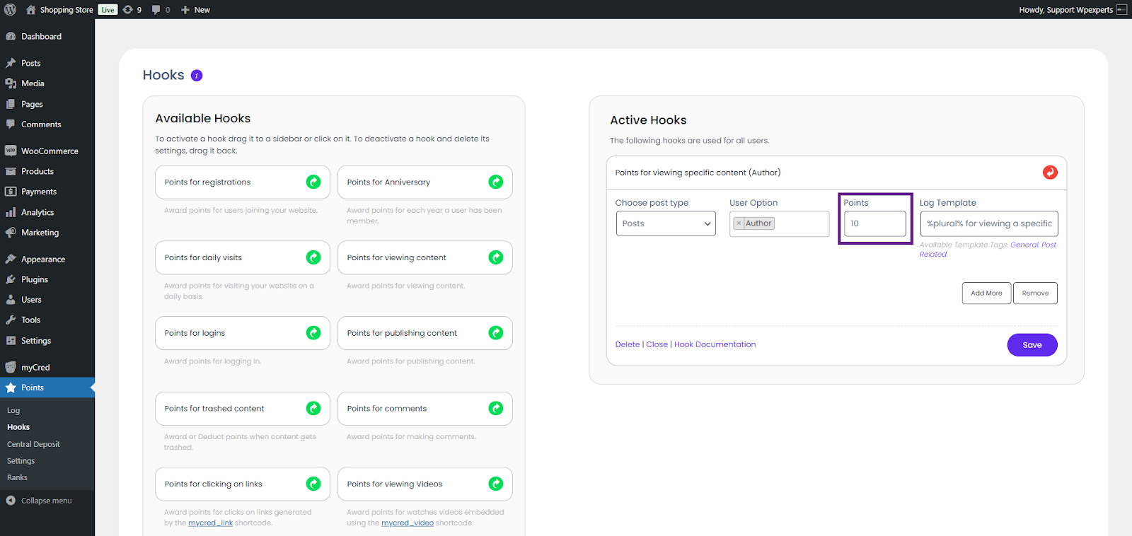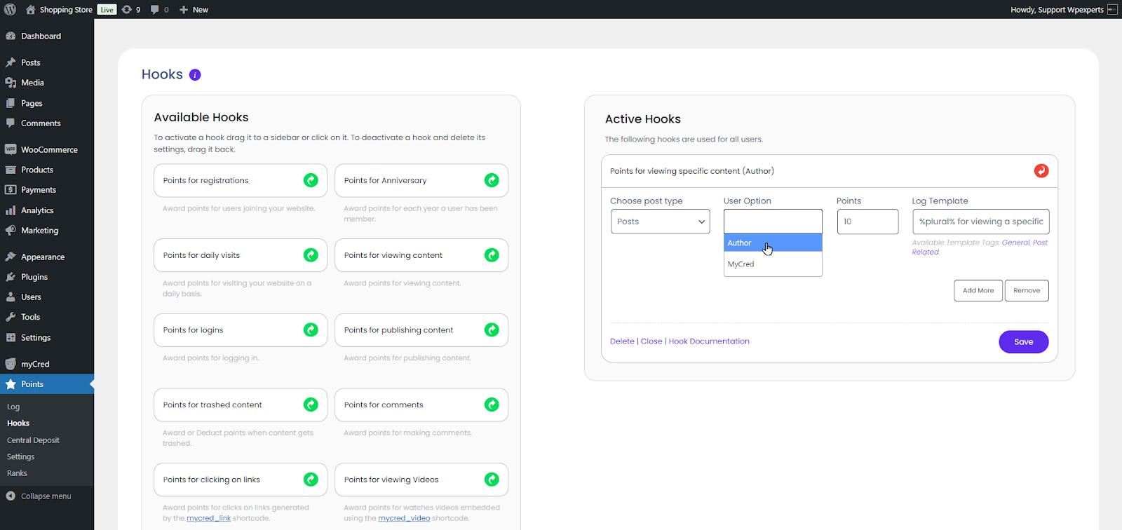 Once done, click the Points for Viewing specific content (Author) hook to open the hooks settings.