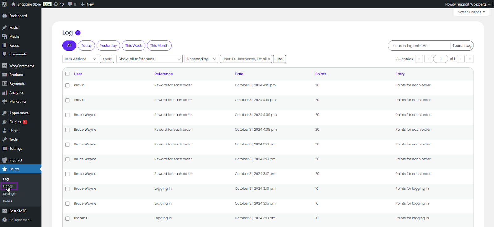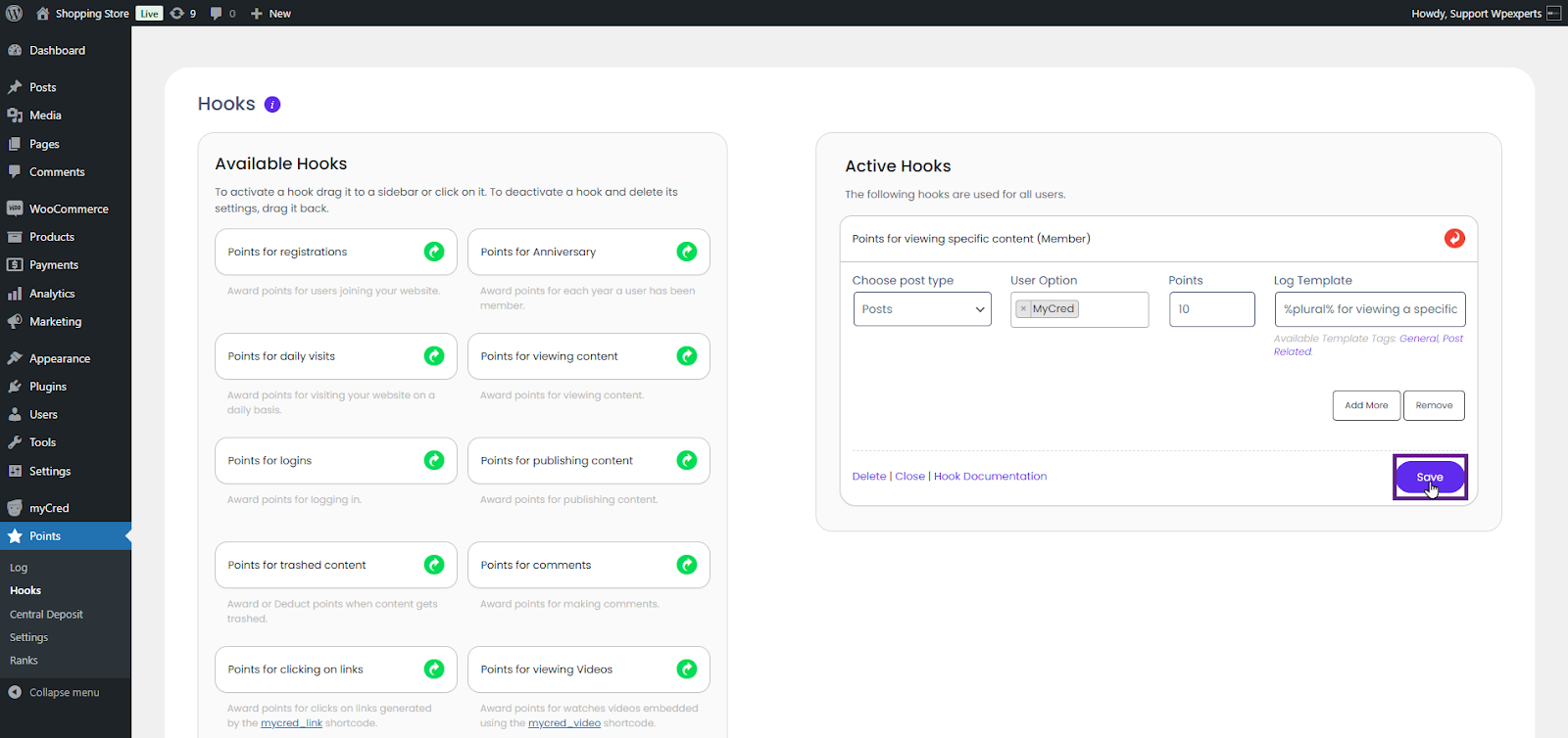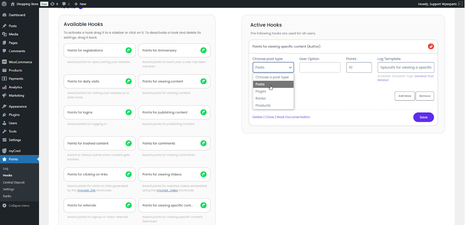 Once done, click the Points for Viewing specific content (Author) hook to open the hooks settings.