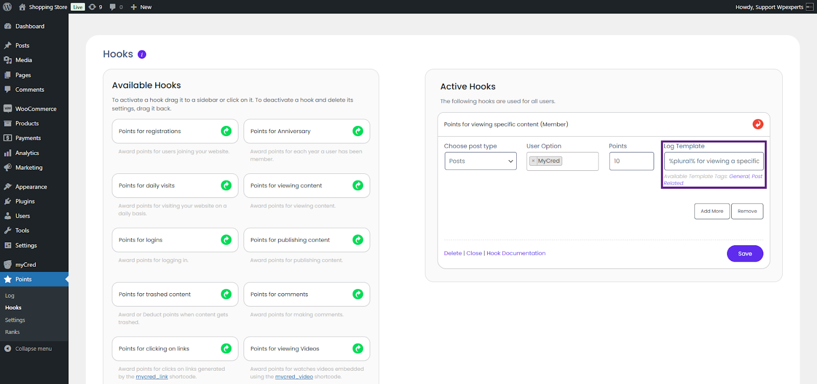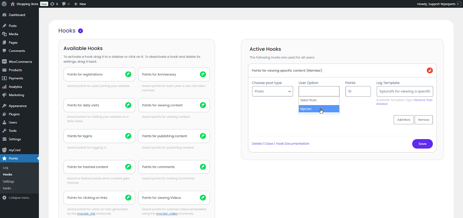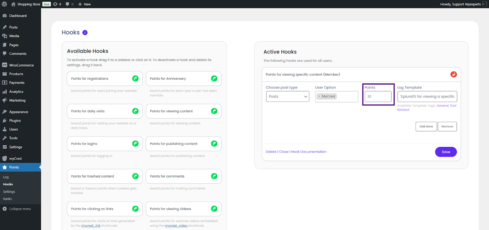 Once done, click the Points for Viewing specific content (Member) hook to open the hooks settings.